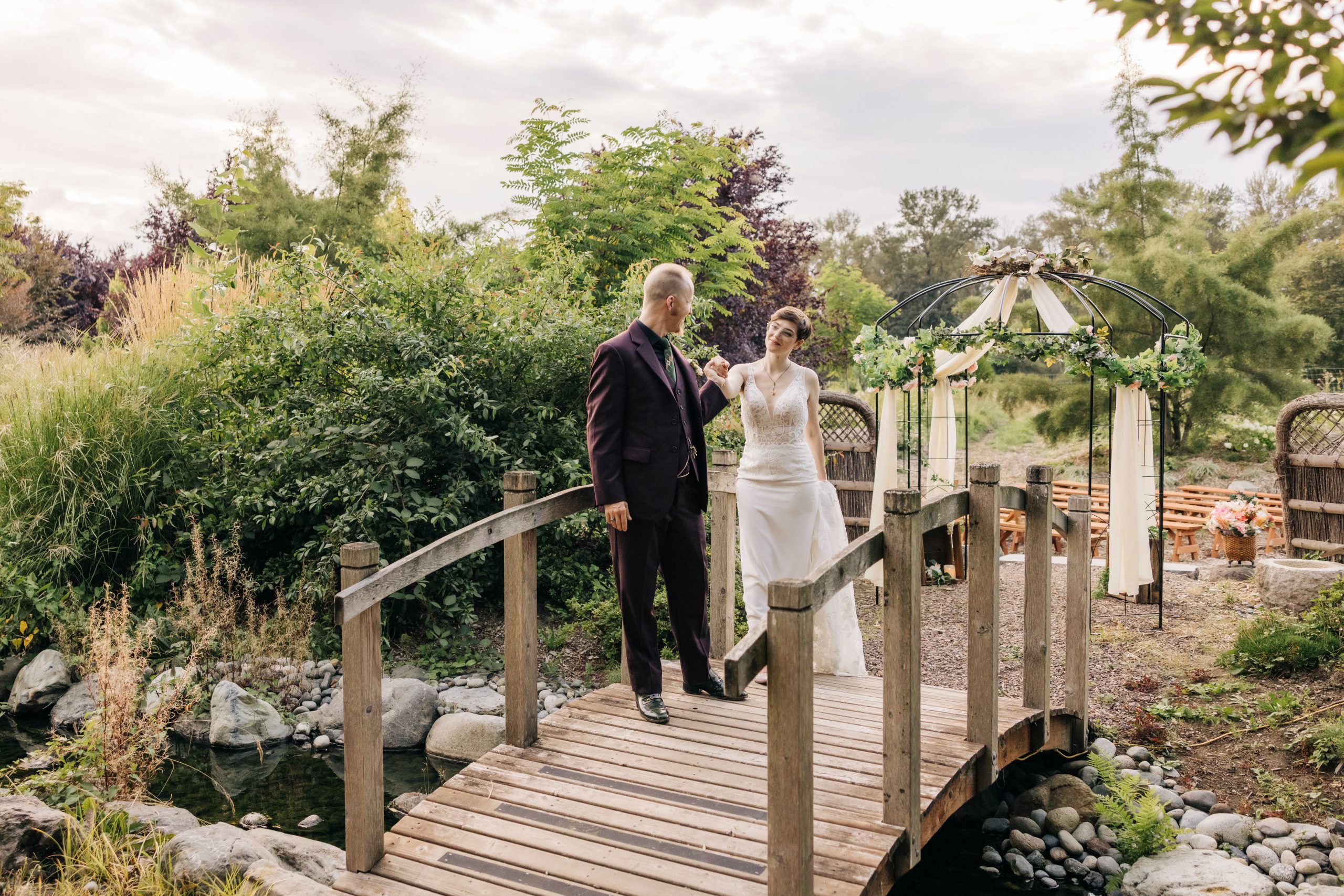 Welcome to the Upper Lawn, a captivating corner of Falling Water Gardens that offers both versatility and charm for your special day! Nestled between towering trees and delicate bamboo, with a gentle stream bubbling in the background, this magical location is as intimate as it is picturesque—a perfect setting to exchange rings and begin your forever.